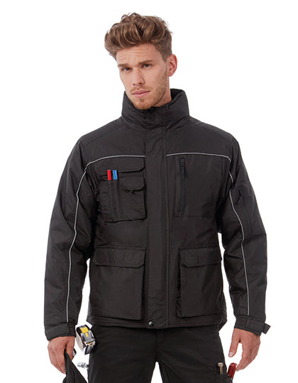 Außenschicht: 100% Ripstop-Polyester, wasserdicht (5.000 mm), windabweisend (230 g/m²) | Innenschicht: Wärmeisoliertes, dick wattiertes Futter (200 g/m²) für zusätzlichen Wärmeschutz | Hochfunktionale, schwere PRO-Jacke mit ergonomischer versteckter Kapuze | 12 Multifunktionstaschen | Längere Rückenpartie für Bewegungsfreiheit, Wärme und Schutz beim Bücken oder Knien | Reflektierende Paspelierung an Vorder- und Rückenteil für mehr Sichtbarkeit und Sicherheit | Ripstop-Außenschicht sorgt für mehr Widerstandsfähigkeit gegen Abnutzung und Verschleiß | 1 leicht zugängliche Smartphone-Tasche mit Klettverschluss außen, 3 zusätzliche Stifttaschen außen, 2 Fronttaschen mit Zweifach-Eingriff mit seitlichem Zugriff auf Fleece-Handwärmer | 1 aufgesetzte Innentasche für Brieftasche | 1 Armtasche mit Reißverschluss | Ergonomische Reißverschluss-Züge für einen leichten Zugang | Verstellbare Bündchen mit Klettverschluss für einen besseren Sitz | Stoff für alle Drucktechnologien und zum Besticken geeignet | B&C Collection ist Mitglied der Fair Wear Foundation