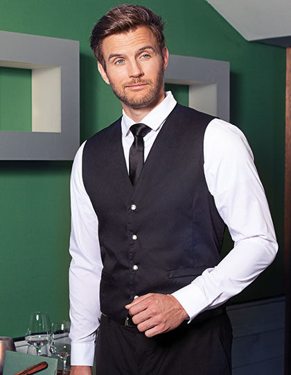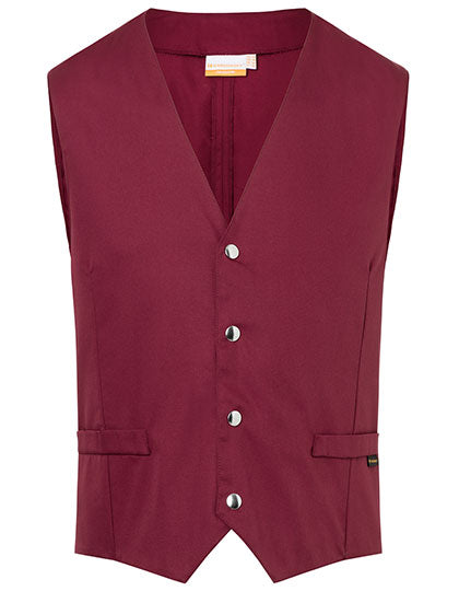 Köpergewebe, 215 g/m² | Hochveredelt, gekrumpft, waschecht, pflegeleicht | Herrenweste mit körpernaher Passform, Abnäher | Hinteres Taillenband durch Druckknöpfe verstellbar | 2 seitliche, imitierte Leistentaschen | 4 Druckknöpfe an Verschlussleiste | Industriewäschetauglich | Bis 95°C waschbar